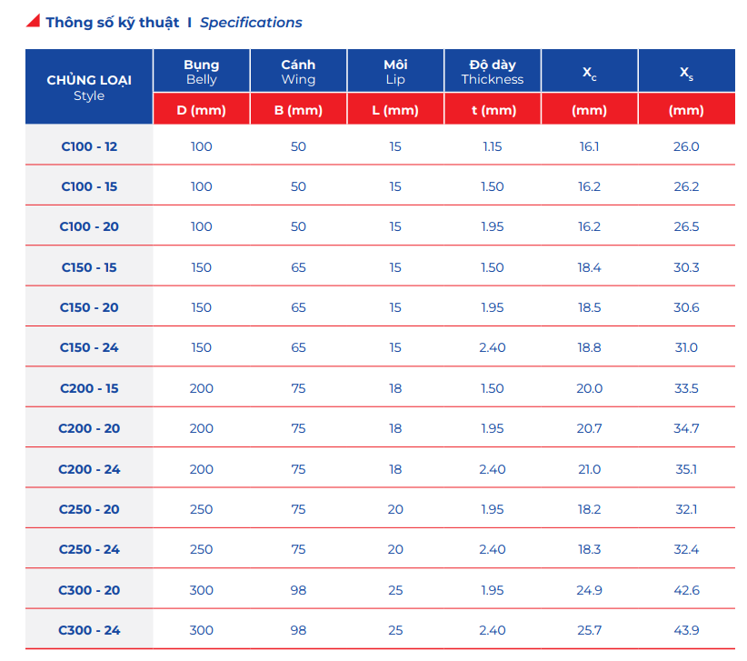 Kích thước phổ biến: C100, C120, C150, C200…